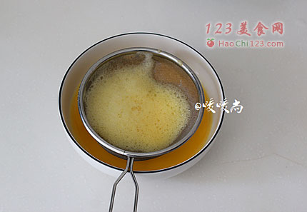 3、蒸蛋羹的鸡蛋液要过筛两次,这样可以滤出大部分没完全打散的鸡蛋絮和气泡。