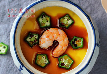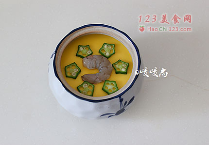 7、待蛋羹表面凝固后取出,将秋葵和虾仁小心的码放在蛋羹顶部(可以轻微的晃一下容器,确定蛋羹中间凝固再放虾仁,要不然蛋羹会被虾仁的重量压塌影响卖相),盖上盖子再入蒸锅蒸5-6分钟至虾仁熟透即可关火。