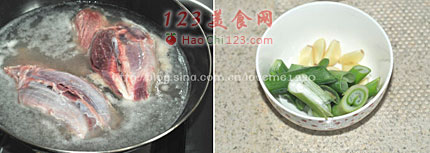 2、葱切成段,姜片,大蒜准备好。