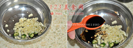 7、小辣椒切成圈,大蒜切成末放入碗里备用。