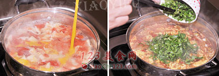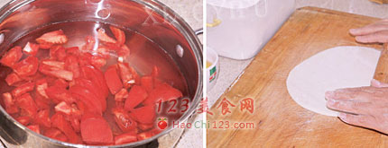 3、西红柿洗净切成块儿,放入600ml左右的清水,放在过上开火煮开。