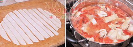 4、面片先擀好,切成长条,这样揪片儿就变得很容易,揪片儿的时候要把火调成小火。