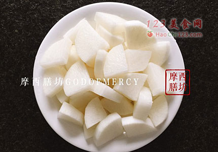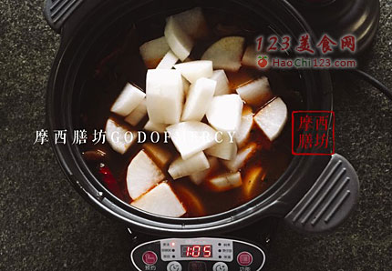 6、盖上锅盖,慢慢炖煮。炖到时间过半时,加入萝卜,盖上锅盖继续炖。