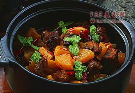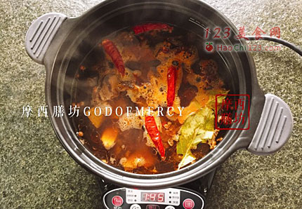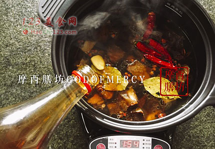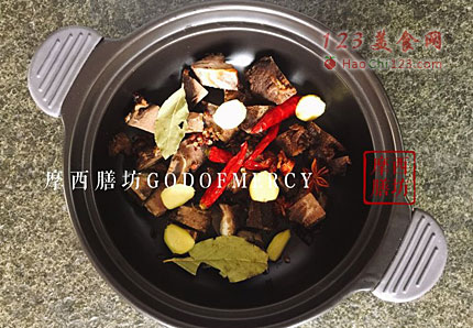 2、加入生姜、干辣椒、花椒、八角、草果、香叶。