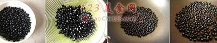 2、放入平底锅中小火炒至黑豆皮爆开,露出绿色的豆肉。