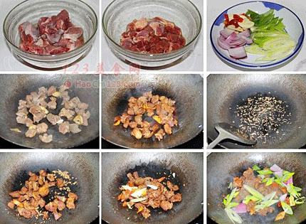 4、锅热油大约7成热,倒入羊肉大火爆炒至表面焦黄,装起备用。