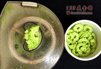 4、果汁机用清水冲洗干净后,用刷子将过滤刀片刷洗干净。将切好的苦瓜放进榨汁孔中,启动电源榨苦瓜汁。