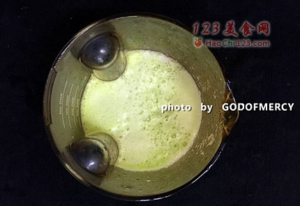 5、苦瓜汁榨好后;上面有一层泡沫,拂去泡沫即可。