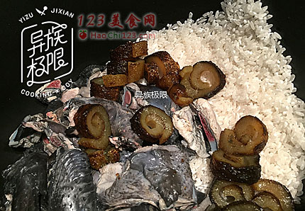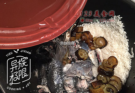3、大米是要淘洗干净的,再将它与烫过水的乌鸡放入锅中。