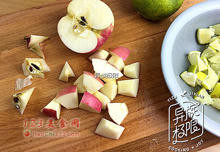 2、苹果不去皮,对半切,去芯后改刀切小块。