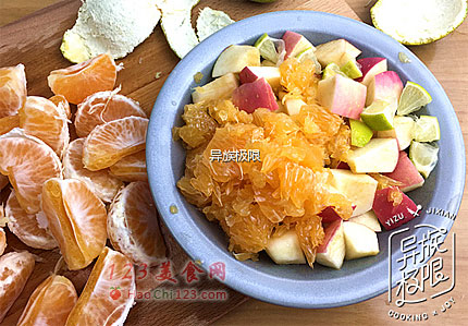 3、橘子掰去皮,用剪刀剪去白丝再手撕取果肉;取出橘子肉;切块的水果用一个大碗收集起来。