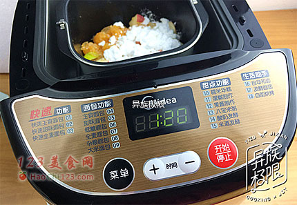 5、面包桶放入面包机中,选择菜单里的甜品功能“果酱制作”,按开始键,即可看到显示屏有P12和1:20的数字交替闪烁,说明是选择了第12个功能,全程需要1小时20分钟。