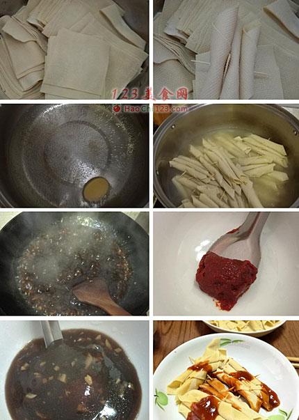 6、干豆腐煮好后捞出浇上酱汁或者直接用干豆腐串蘸着酱汁吃也可以。也可以把干豆腐串撸下来再蘸酱汁,总之随心所欲的吃吧。怎么吃都是好吃。配着煮干豆腐的汤喝,非常鲜美。