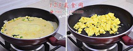 7、倒入蛋液,小火操作,以防蛋被炒焦糊。