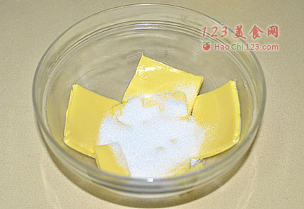 1、黄油切片室温软化后加入细砂糖。
