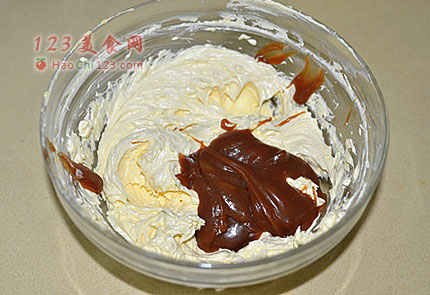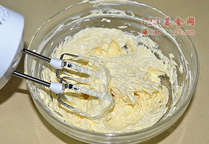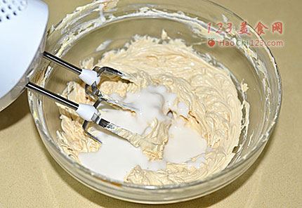 4、加入奶油焦糖酱用电动打蛋器打均匀。