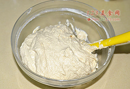 6、低筋面粉和泡打粉混合过筛二次后加入。用刮刀翻拌均匀。