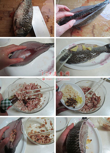 3、用剪刀剪去鱼骨,清除内脏,这样鱼腹里面就成了空囊。