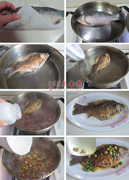 4、煎好的鱼再倒入适量的开水,加入生抽和酱油等调味料炖煮,九成熟时加入适量的盐调味;煮好后将鱼盛出,再加入青豆和玉米和水淀粉勾芡,将收好的汁浇淋在鱼表面上,最后加上金钱(红萝卜)装饰。[LaoYanHuo.com]