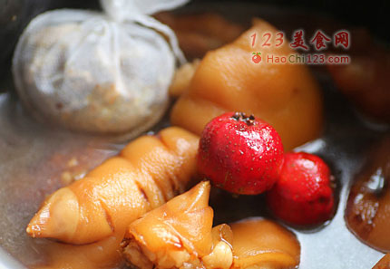 4、炖猪蹄时加上几个山楂,山楂中脂肪酶可促进脂肪分解,所以肉类炖的过程中会更容易熟,还可以使汤不油腻,清新可口。[LaoYanHuo.com]