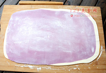 3、然后叠在一起;擀成长方形面片(如果喜欢成品颜色层次分明,那么面皮要擀得厚一些,大概0.3-0.4厘米的样子;如果像我这样喜欢成品的颜色比较柔和,则将面皮擀得薄一些,大概0.2厘米的样子)。