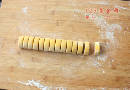 4、将面皮由短边的一头开始卷起来;卷好后切开成小剂子。