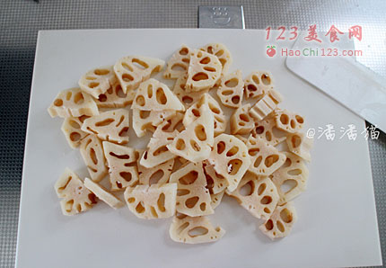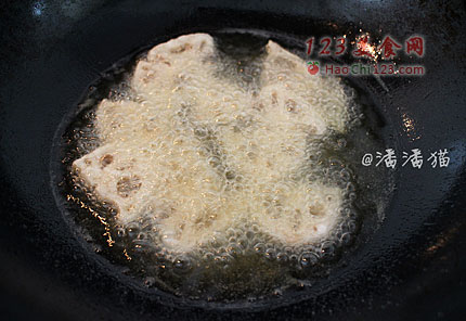 3、在锅中倒入大量的食用油,油温大概五成热的时候下入藕片炸制。炸制略微上色后捞出。提高油温到六成热,下入藕片进行第二遍复炸,这一步非常关键。前面的炸制是为了去掉藕表面的水分,第二遍炸制是为了让藕变得更脆,不用炸很久,入锅大概20秒就可以捞出,沥干油份。