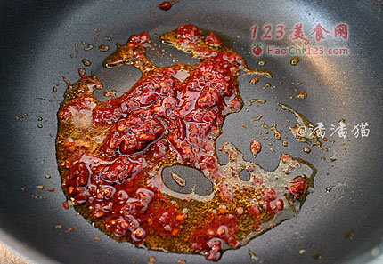 5、起锅倒入少量的油,用中小火煸炒郫县豆瓣酱,炒出红油后倒入1勺料酒烹炒。