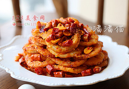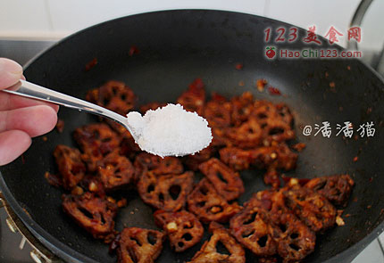 7、下入炸好的藕片,让酱汁裹住藕片。调入适量的糖来中和辣味。