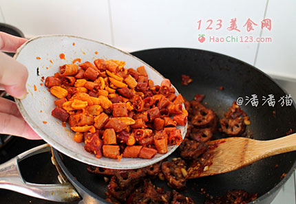 6、放入葱姜末翻炒。