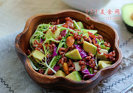 6、将除巴旦木和红米饭之外的材料混合,浇上油醋汁拌匀,最后撒上适量红米饭粒和巴旦木果仁即可食用。[LaoYanHuo.com]