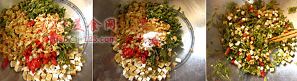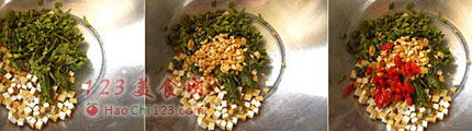 5、接着放入切好的香椿碎、花生碎、虾米碎、枸杞。