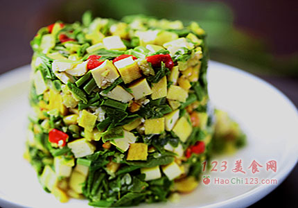 6、所以材料都放进去后加入盐、糖、香油拌匀装盘即可。若想摆个造型,把拌好的各种食材装进杯子或模具里,用勺子按压定型倒扣在盘子内即可。