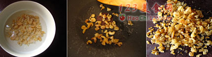 2、虾米用温水泡软并洗干净沥水,锅内放油炒香后切成碎末备用。