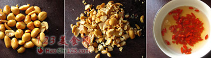 3、花生米用锅炒至微黄,去皮后用刀压碎,如果有炸好的花生米直接压碎就好了;枸杞用温水泡软备用。