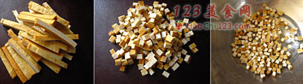 4、香干洗干净后用开水略烫一下,先切成条再切成小丁,切好的香干丁放入料理盆内。
