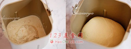 2、如果手揉,酵母先用少量的温水化开,与面粉揉成面团后加入油继续揉至面团光滑,盖上湿布在温暖处发酵至2倍大。
