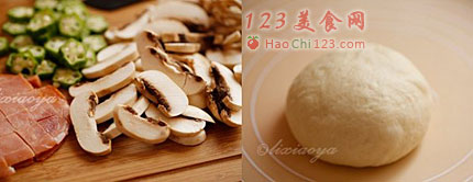 3、面团发酵的过程中,可以准备披萨馅料,口蘑清洗干净后切成片,火腿片切成小丁,秋葵切成与口蘑一样厚的小片,马苏里拉擦成丝。