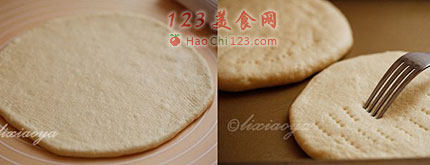 6、或者像某丫一样直接擀成刚好能放进2个饼皮的烤盘内,约17cm,用叉子在面饼上扎上小孔以便更好的给面团排气和更平整些。
