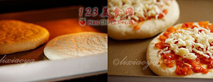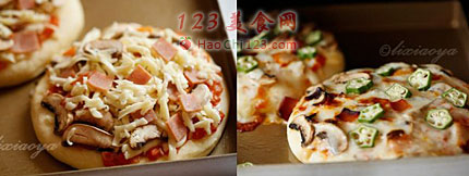 9、接着再铺上口蘑片和火腿片,上面再撒上马苏里拉,送入提前预热好的200度烤箱里,中层,烤10分钟。