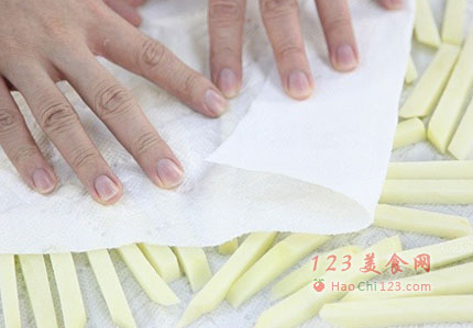 2、切好的土豆条用清水冲洗2次,洗掉表面的淀粉。将土豆条沥干水,用厨房纸巾将表面的水分彻底擦干。