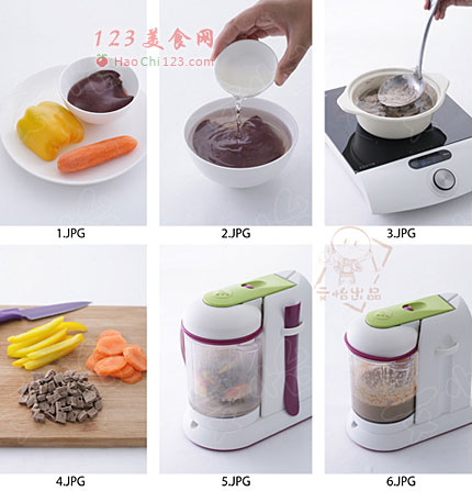 5、如果没有辅食机,可以用蒸锅把胡萝卜和彩椒蒸熟,再和煮熟的猪肝一起用料理机或者搅拌棒搅打成泥,搅打的时候要加少许饮用水,才能打的更细腻。