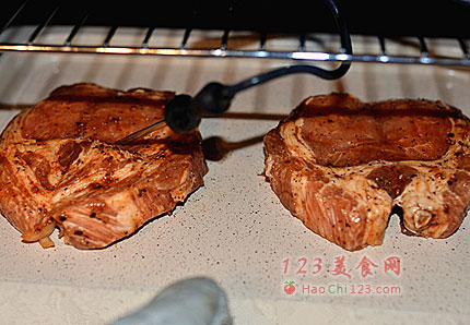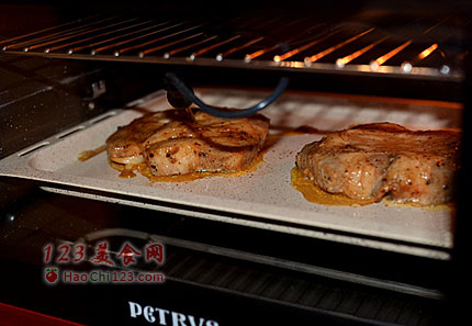 3、腌好的肉取出放于烤盘上。先将食物探针安装于烤箱右上方的插座里再预热烤箱至200度,预热完成后,将烤盘放入中下层,将探针的金属针插进梅花肉的中部,关上烤箱门开始烘烤。