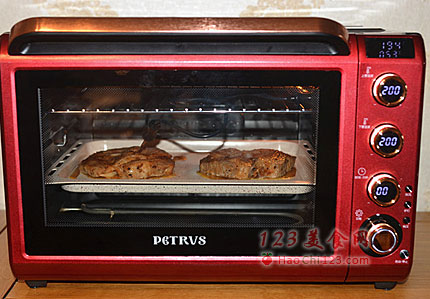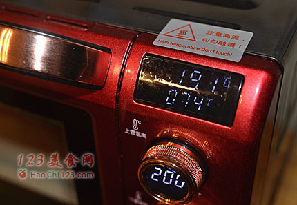4、要注意,控针的头部和硅胶线不能接触到发热管,烘烤中途可以通过烤箱右上方的显示屏观察炉内的温度和肉中心部位的温度。