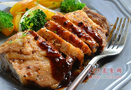 6、蔬菜煮熟调味后摆盘,烤好的梅花肉切块淋上黑椒汁即可享受。