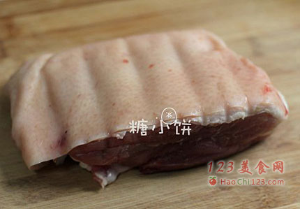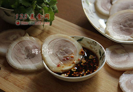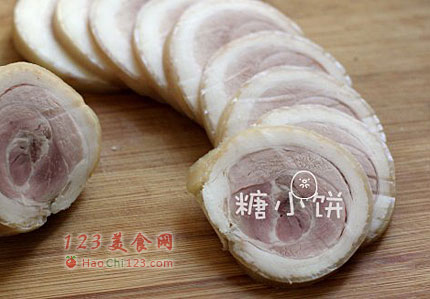 6、加盖炖煮2个小时左右关火,留在汤中放凉后再捞出切片即可(切片看起来一棱一棱的是因为我是用小刀像锯木头那样拉拔着切的),因为盐放足了所以可以直接吃,我喜欢用蒜、醋、香油和辣椒等调成蘸料配食。
