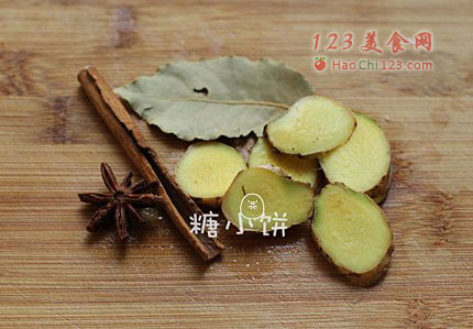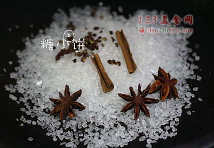 2、海盐180G,八角3个,桂皮2段和花椒1把(约20颗),放入锅里中火翻炒至香料散发出香味。