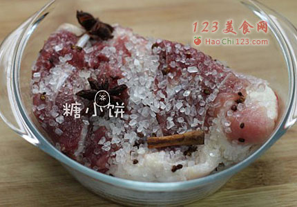 3、放凉至不烫手后抹在去骨的蹄髈肉表面,腌制一天一夜,冬天可以就放在阳台等阴凉的地方,夏天需要放冰箱。