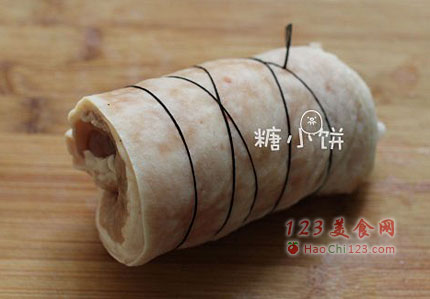 4、腌好的肉去除表面附着的香料和盐粒,肉皮朝外卷起来,用棉线捆好定型。