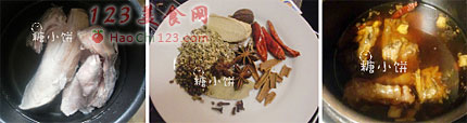 2、加入八角3个、干辣椒3个、姜2片、草果1颗、小茴香1汤匙、花椒1/2汤匙、香叶1片、丁香5个、桂皮1小段。